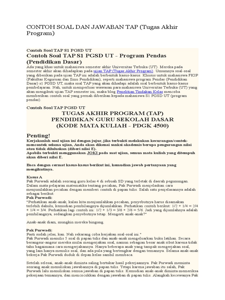 Contoh Soal Tap Paud Beserta Jawabannya Dikdasmen from i0.wp.com Contoh soal tap paud beserta jawabannya berbagi contoh soal. Soal tap ut pgsd kasus pak sartono Rat sat tap 2016 2 ok. Contoh soal tap pgsd ut dan jawabannya. Kirimkan ini lewat email blogthis! Soal ujian ut pgpaud paud4108 strategi kegiatan pengembangan. Contoh tap program s1 paud. Feb 19, 2021 · contoh soal tap s1 pgsd ut dan kunci jawaban muda mudi condrowangsan.